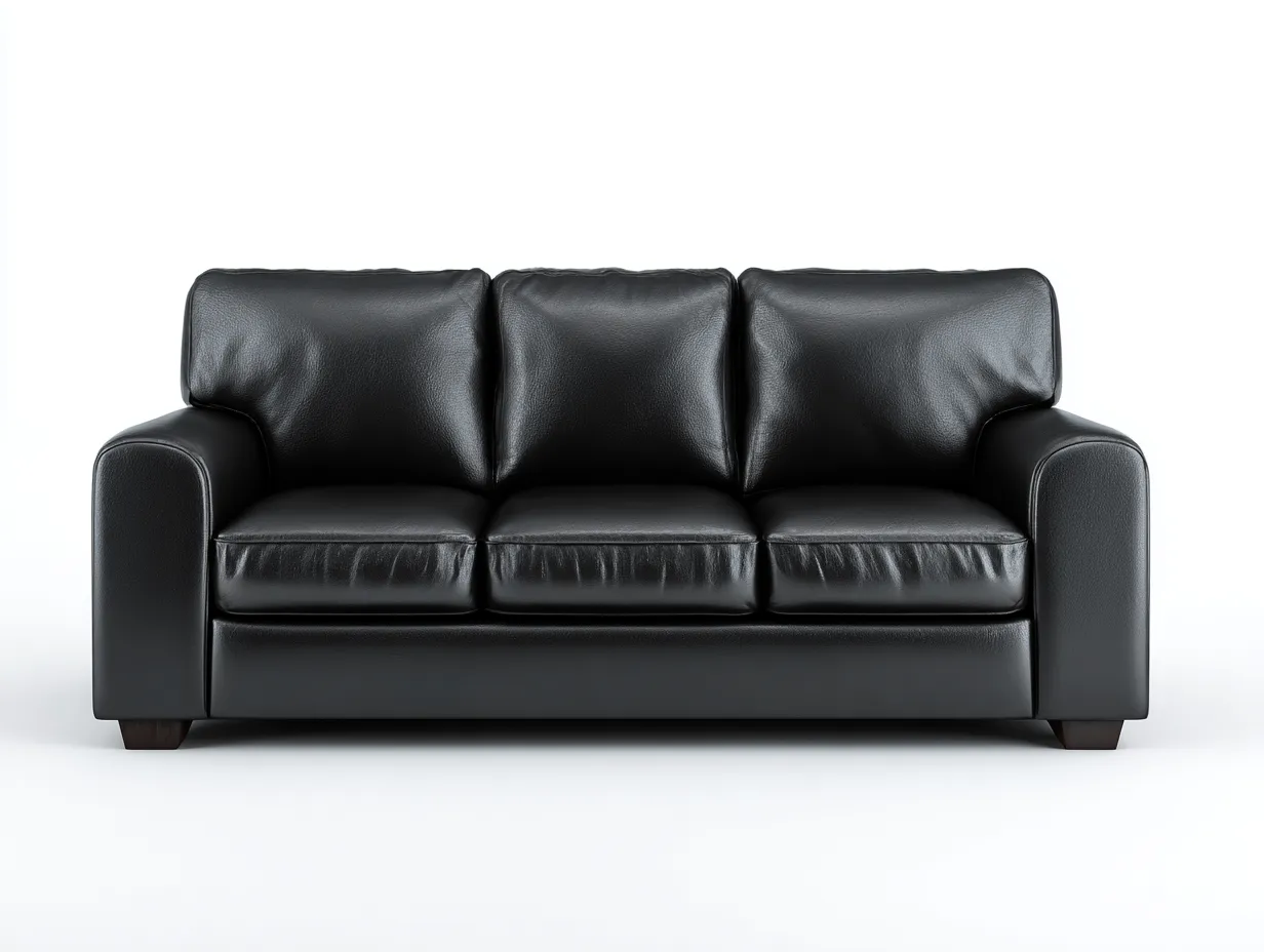 Le canapé est revêtu de cuir noir à la finition lisse, sélectionné pour sa résistance et sa facilité d'entretien. La structure interne est conçue pour assurer stabilité et durabilité, tandis que les coutures visibles renforcent l'aspect soigné de l'ensemble.